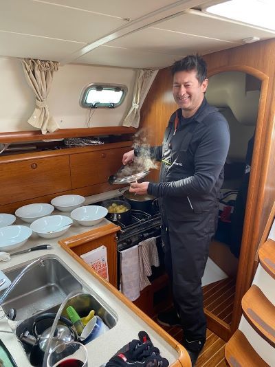 After racing, while the rest of the crew tidy up sails, ropes etc., the pot is heated up on the cooker and served with a glass of wine.