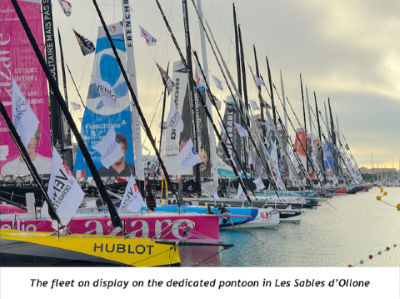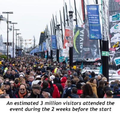 Arriving at the Vendée Globe village at 10am on a Saturday morning in early November can only be described as an awe-inspiring and even jaw-dropping experience for even the most experienced visitors and competitors to an international sailing event. The queue for going down on to the marina to see the boats was already 2km long – the French families with prams and packed lunches were clearly prepared to spend hours happily soaking up the atmosphere as they inched towards the distant marina and enjoying the spectacle as they transversed the amphitheatre that the marina and port create. To see crowds like this at a sailing event left me stunned. Our tickets indicated (by a traffic light system: green, orange and red) that the busiest times would be from 12:00-14:00. By late that evening, the event organisation team hasd confirmed that 250,000 people had visited the event that day. The Vendée (local council) representative told us that they were expecting more than 3 million people to have visited over the 2 weeks and additionally, on the morning of the race start, that up to 500,000 people would line the port to cheer the sailors out through the fairway channel in a procession that would take 6 hours.