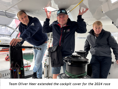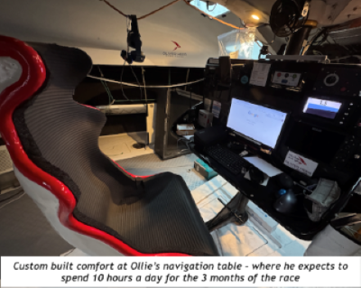 Ollie’s IMOCA is one of the non-foiling boats in this event, with 2 daggerboards rather than the foils of the newer designs. This might reduce his top speeds but he believes that the boat is strong and gives him the best chance of finishing the non-stop single-handed circumnavigation. It is also one of 3 boats that has the original rig, with considerable proven mileage. He gave us a personal tour of the boat, showing where he made alterations to the cockpit design with a new semi-open cover from where he will be managing the trimming and controls. The team constructed a new one from scratch, using their expertise to lay up carbon cloth and foam core, before moulding them into the desired shape. These panels were then bonded together and permanently fixed to the boat. This new design, proposed by a local composite design office, is larger, wider and higher than the previous one. This will offer skipper Ollie much greater protection from the wind and waves during his journey through the Southern Ocean, ensuring a slightly less unpleasant experience.