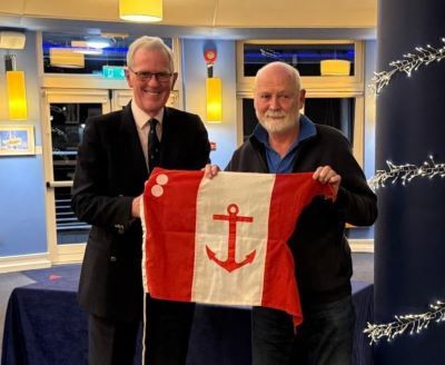 Outgoing Commodore Neil Murphy presents the flag to incoming Commodore Kevin Monks