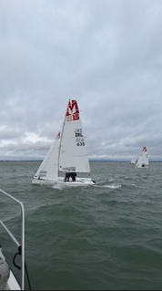 On the second race the timer on the committee boat was surprised to hear a competitor calling out the times for his helm but five seconds ahead of the correct time. The boat however came back from being very OCS.