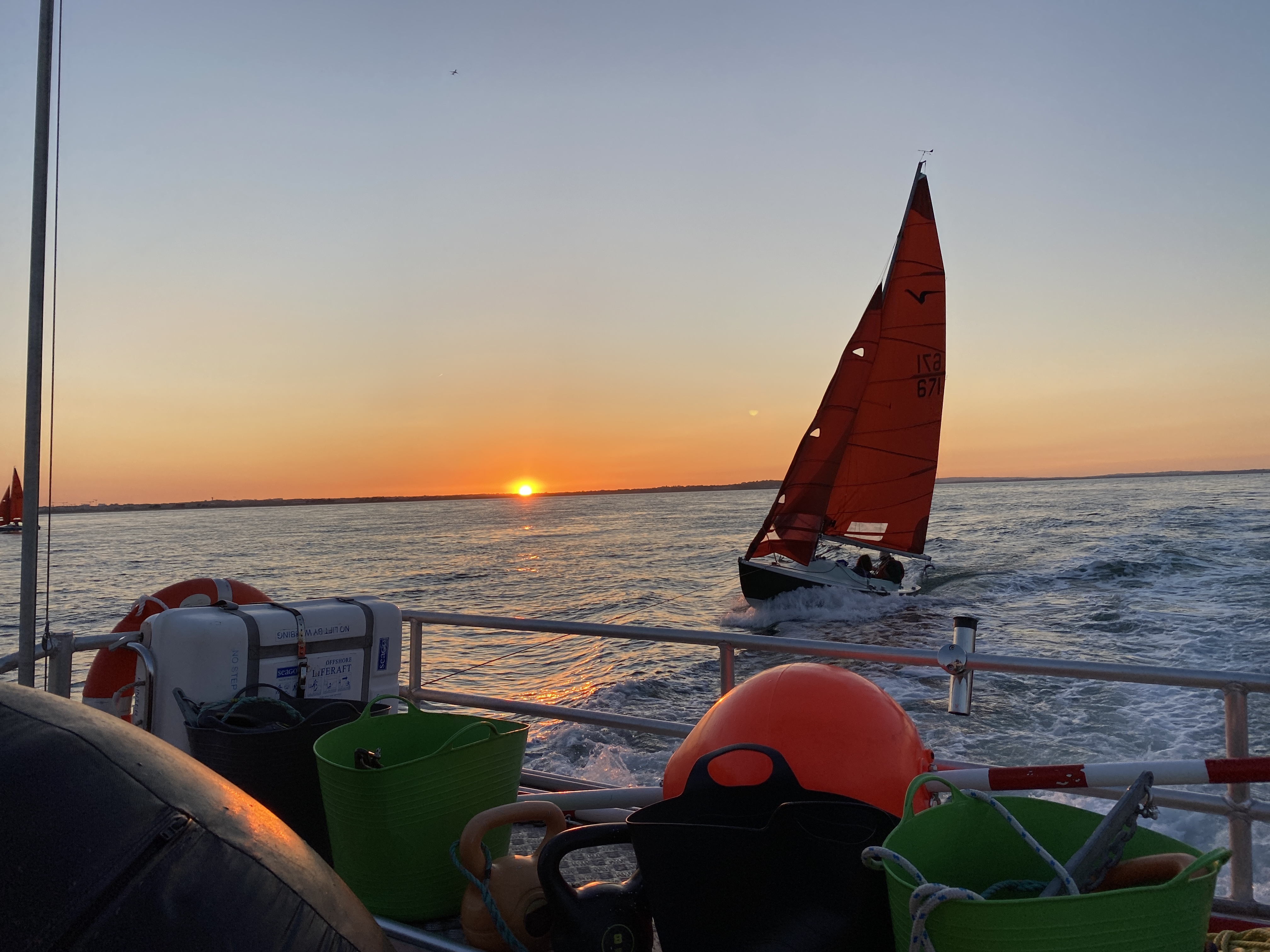 Featured image shows yachts approaching the finish at the island mark in a flat sea with almost no wind. Image below of a Squib being towed in by the committee boat as the wind had fallen away.