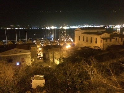 We anchored off the port in 10m of water, one has to come really close to the rocky shore to find shallow water, as we paid out the chain some 50 or so meters, the depth under DeDanann very quickly went to 40m, the weather was getting up as darkness fell so we put out our second fisherman anchor to stop us drifting onto the shore should the wind direction change,