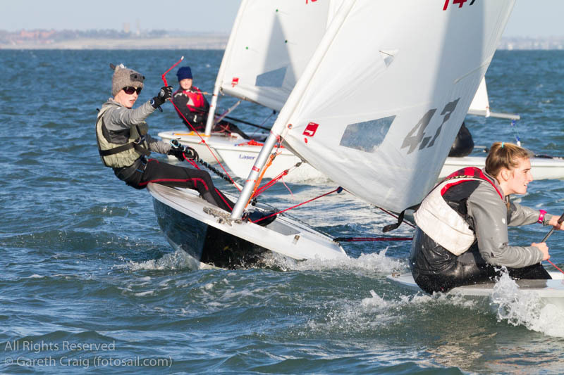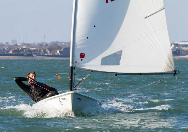 Fifteen knots of wind and bright sunshine welcomed 31 Lasers on the first day of the 40th Laser Frostbites at Howth Yacht Club on Sunday morning. It was a baptism of fire for some, conservative downwind sailing for most, and plenty of off-wind planning and gybe mark capizes. Shifty breeze under the west pier made the upwind legs tricky at times, but our equally effective and efficient race committee (Liam Dinneen, Richard Kissane, John Doran and veteran of the first series David Jones) ran two 38 minute races with practiced presicion.