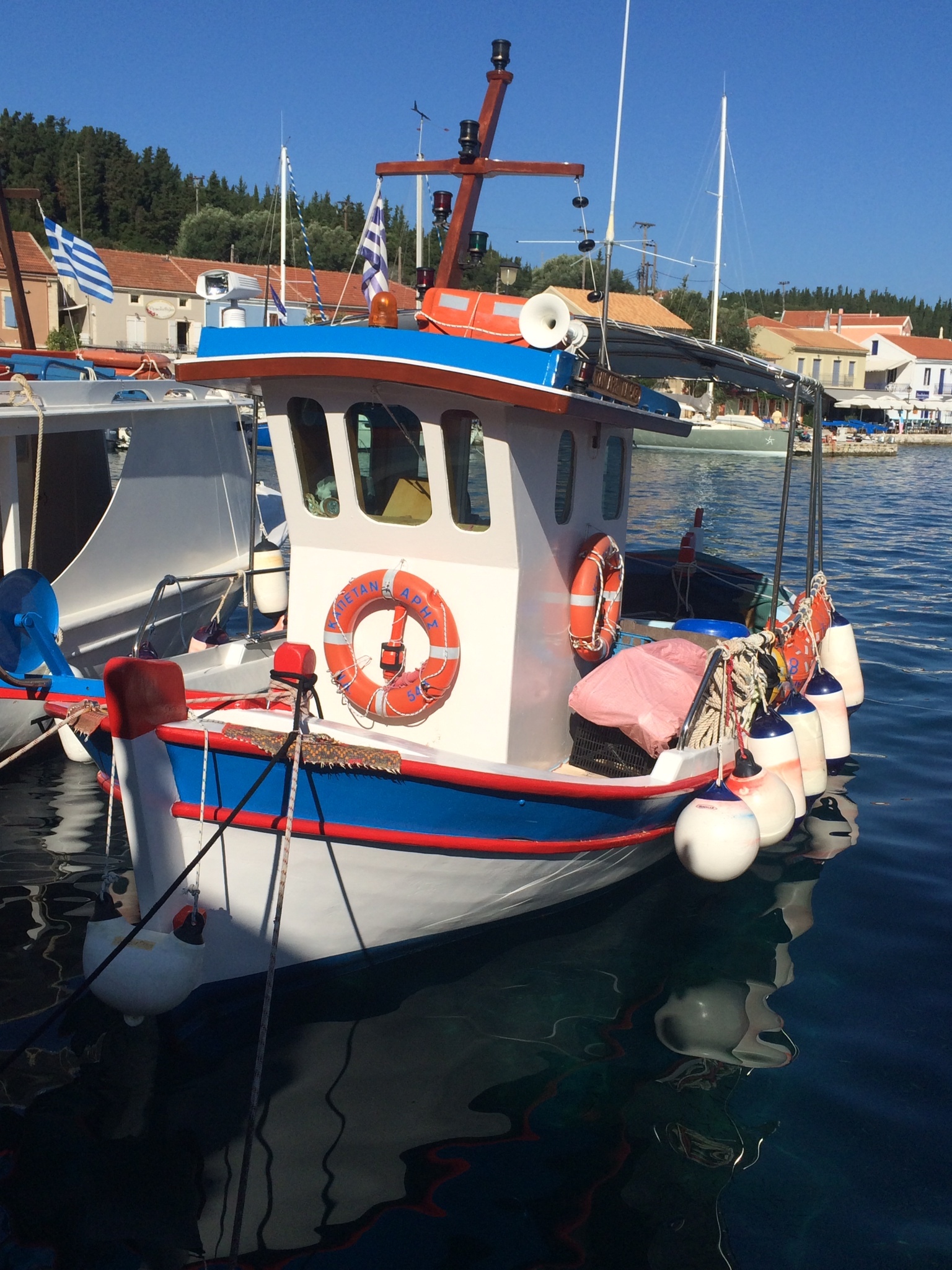 Having spent a few days here in Vathi we headed north again to Fiskardho, DeDanann had suffered some storm damage during our last stay in Fiskardho, we had the engine bay and deck hatches open during one of the better days to dry her out when all of a sudden the wind got up to gale force with torrential rain, DeDanann was being forced onto the quay wall, as I was coming ashore to tend her lines and move fenders etc I was thrown from the passerelle into the water, fully dressed, mobile, wallet , the lot, as I struggled to get out without being crushed, water poured into the open engine bay, when we dried it up and started the generator some days later it packed up, the water damage was extensive and was going to cost a lot of money to repair, it was also twelve years old, so it was decided to change it for a new one which runs at half the revolutions and half the noise, the passerelle was badly damaged also, along with some gelcoat damage to the stern, however, my pride remains intact, having crawled out of the port looking like a drowned rat.