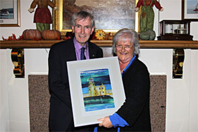 Commodore Breda Dillon presents a painting by Alan McLeod of Howth Lighthouse to John Bennett to mark his retirement from HYC