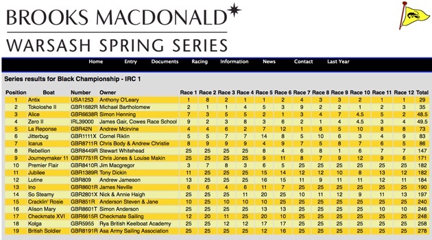 Antix took the 2015 Brooks Macdonald Warsash Spring Championship on Sunday with an excellent performance in what were very challenging Solent conditions.  Last weekend had a large Howth influence aboard, with Dan O'Grady and Ross McDonald trimming, while Dylan Gannon was hard at work running the bow.