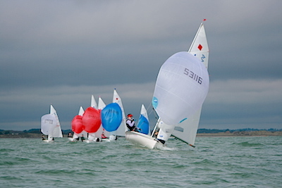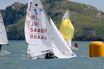 very light south easterly filled. Peter McCann & Harry Whitaker from Royal Cork Yacht Club appeared to have a comfortable lead in the second race, until a misinterpretation of the sailing instructions handed the win to Lizzy McDowell and Anna O’Regan from Howth Yacht Club/ Malahide Yacht Club.