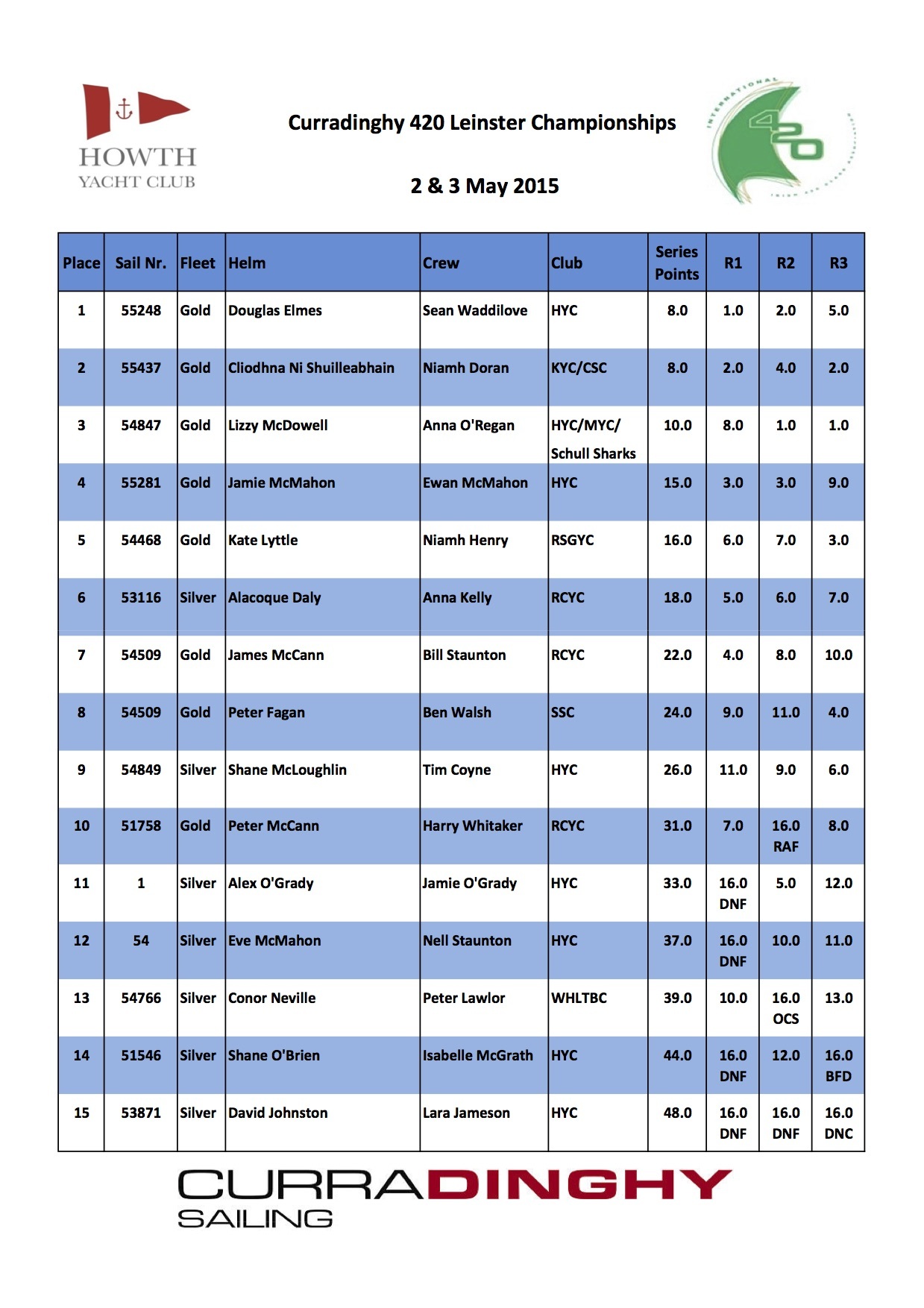 The 420 Leinsters took place in Howth Yacht Club on the weekend of 2nd/3rd May. The event which was sponsored by CurraDinghy Sailing also served as the second leg of the 420 Class Association trail series for teams for the Open and Ladies World Championships and Junior European Championships.