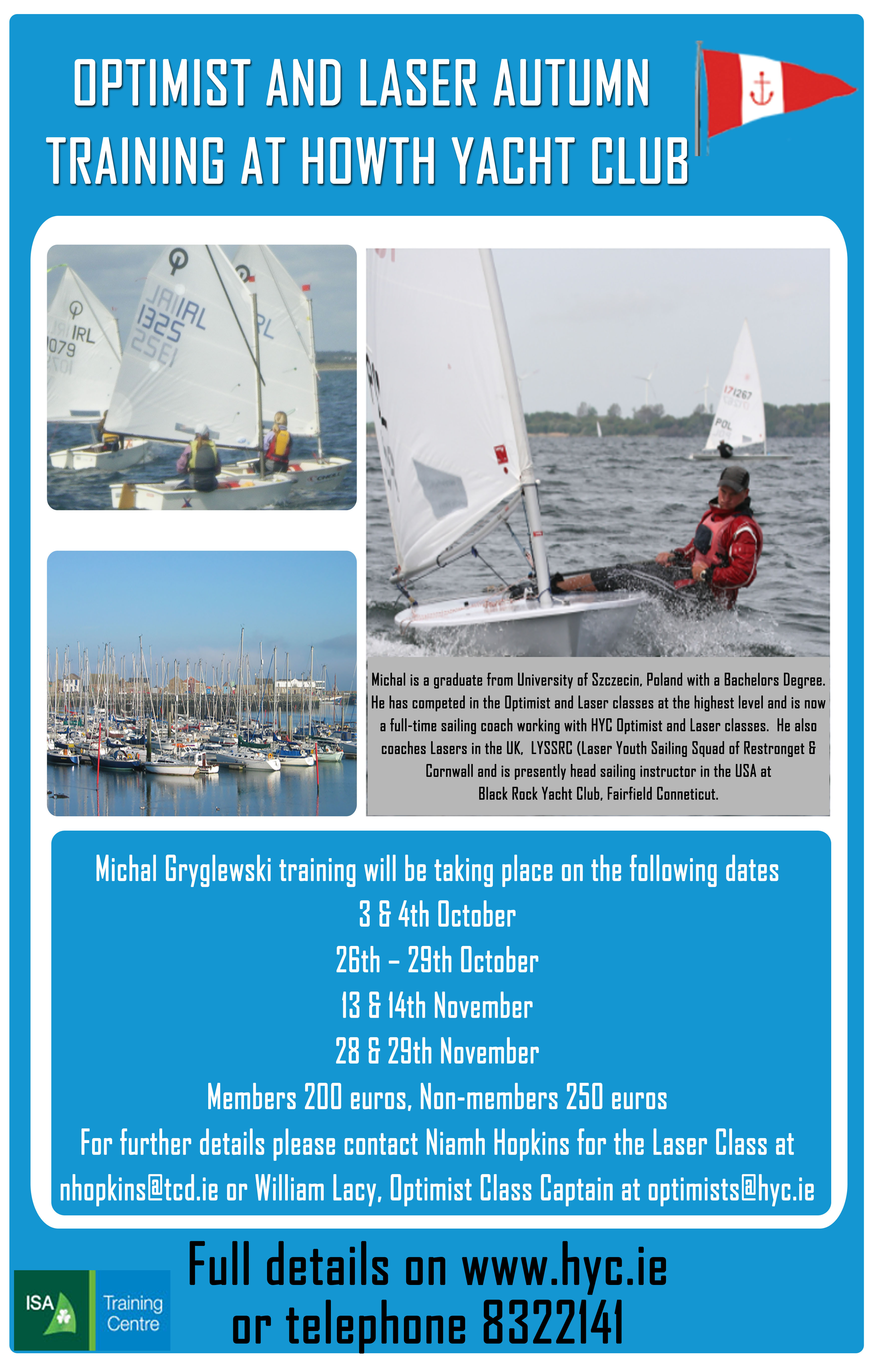 Enquires should be made to Niamh Hopkins (Laser Class) - nhopkins@tcd.ie or to William Lacy (Optimist Class) - optimists@hyc.ie