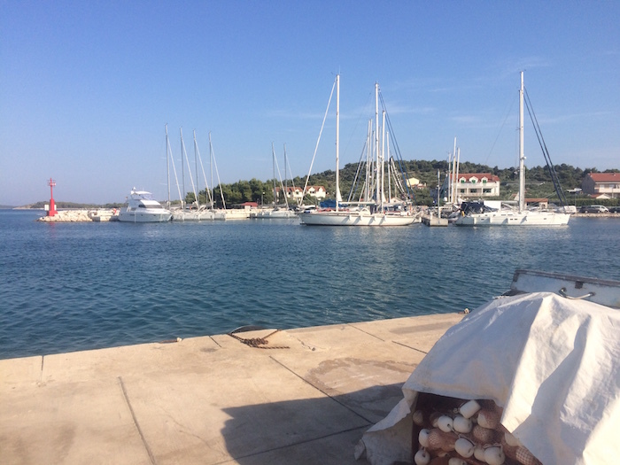 port on Otok Pasman (Pashman) were we came along side the pier, it was the first and only port that I came across were a cruiser could stay for free, no water or electricity, but that doesn't bother us as DeDanann has 1000 litres of water in store and a good genny. I had wanted to take the time to varnish all the cabin floors and with just myself and Alfie on board this was the time to do it, so up early each morning whilst it was cool, rubbing down and varnishing done before midday, then a long lunch in the port side taverna which was glad of the business as I would have a three course meal and a half bottle of their best wine to wash it down, then back to DeDanann for our siesta under the Bimini as the varnish dried, the living was easy here and I was up for enjoying it.