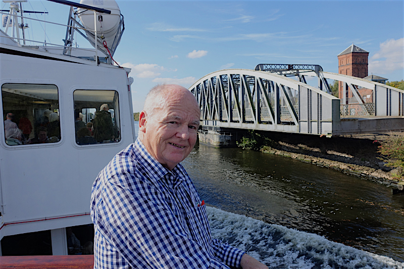 The Manchester Ship Canal was the ROMEO’s last outing when on Wednesday 30th September 27 of them boarded the 06:20 Ryan Air flight to Manchester. Two trains for £4.20 brought them from Manchester Airport to Salford Quays where they were joined by John Kearon who was in charge of the Asgard conservation. John had travelled, as arranged, from his home in Liverpool to join us. Boarding the “Royal Iris”, with a couple of hundred other people, we departed Salford Quays for the scheduled six hours through the 58 km to Liverpool. The Canal opened to its first traffic on 1st January 1894 is now crossed by 21 bridges and five sets of locks lifting and lowering vessels 17 metres. The entrance locks at Eastham on the Wirral side of the Mersey, which seal off the tidal estuary, are the largest on the canal. The larger lock is 600 feet (180 m) long by 80 feet (24 m) wide; the smaller lock is 350 feet (110 m) by 50 feet (15 m).