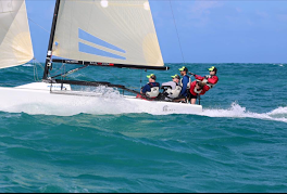 way; sailing out from Downtown, through the channel and Miami Port, known as “the cut” to the open Ocean off Miami Beach. The constant stream of super yachts and famous high rise apartments were a constant reminder that we were in the party city of Miami. Once out on the ocean it was steady breeze and plenty of swell, making hiking hard work and at times vomit-inducing, but worth every bit of it for those down-wind sleigh rides! Once that kite was up and the boat was up on the plane on those big waves, I couldn’t wipe the smile or spray off my face – these boats are fast and WET!
