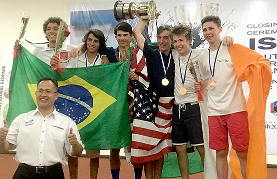 (Top photo: Doug helming and Colin on the trapeze of their 420 during the Youth Worlds in Langkawi - below: the guys on the podium with the USA and Brazilian medal winners)