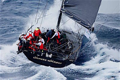 The forecast had a ' 'Southerly buster' hitting the fleet between 8pm and midnight, depending how much progress to the south we had made. We gybed onto starboard at about 2130 in 20-25 knots of breeze. Very suddenly the sky in front of us went pitch black and within a few minutes we were smacked with 40- 50 knots of cold air from the south. We managed to get the A4 down without breaking the boat or the crew and carried on with 3 reefs and our J4. The wind built and we became so overpowered that we dropped the main and sailed under jib only for a few hours, still managing upwards of 10 knots boat speed but sacrificing a lot of height. A long night on the rail ensued and by sunrise we still had in excess of 35 knots on the nose with 3 reefs and a J5. At little over 10 tonnes Chinese Whisper is light. With its flat bottom and narrow bow section the boat took quite a hammering through the choppy sea state. We slammed our way upwind for around 30 hours before the pressure started to subside. We did well to get through the front without any damage and to our delight we found out were up to 7th on line, due partly to the unfortunate retirement of a number of boats including Wild Oats XI and Perpetual Loyal. We were within a few miles of Ichi Ban on the morning of the 28th. We spent much of the day playing shifts and trying to get back to the right of the Carkeek 60. Eventually we got inside them and took the lead.