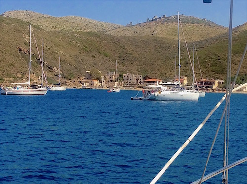 Porto Kayo was our next port of call, it's not a port at all, but a well sheltered anchorage surrounded by very steep hills, it has a little beach and three tavernas, despite it being the "back of beyonds" there was plenty of cruisers like ourselves anchored off, we dropped anchor in four meters off the beach with the local karabatic wind blowing off the hills as it does down here in the evenings, we crossed anchors with our neighbour, he wasn't too happy about that, he waited till our anchor was set before telling us, I wanted to leave it till the morning when we were both leaving but he insisted we move it now, we pulled him up with our anchor and off we headed down wind towards the shore tangled together, as I was trying to pull the anchors apart with the boat hook, Linda motored us back out into deeper water to the screaming of our new neighbours " you are towing us" as they ran about their boat in a state of panic, in anyway, we got the anchors untangled and thought it better to move to the opposite side of the port to reset it for the night with no damage to anything other than to our pride, such is the life of the cruiser. Later in the evening, having had a cup of cha, I slipped over in the dinghy to apologise, a couple of little devils of our Teelings Irish Whiskey and we were all pals again, them little devils have got us out of more trouble over these past years I can tell you.