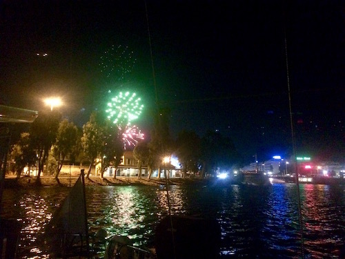 changes every day and you are not given a specific time , you just have to be ready to up and go as soon as the bridge starts to swing, well we were pleasantly surprised, it was a Friday night and there was a festival of sorts on the town quay with good rock bands from Athens belting it out, then at midnight we were anchored under a most magnificent fireworks display that went on for half an hour. We went through during the fireworks to great cheering from the legions of young revellers hanging about the bridge pissed and enjoying themselves, we had intended to head six miles north to an anchorage for the night, the craic was so good we just dropped anchor the other side of the bridge and enjoyed the music till four in the morning, it really was a pleasant experience that we will remember.