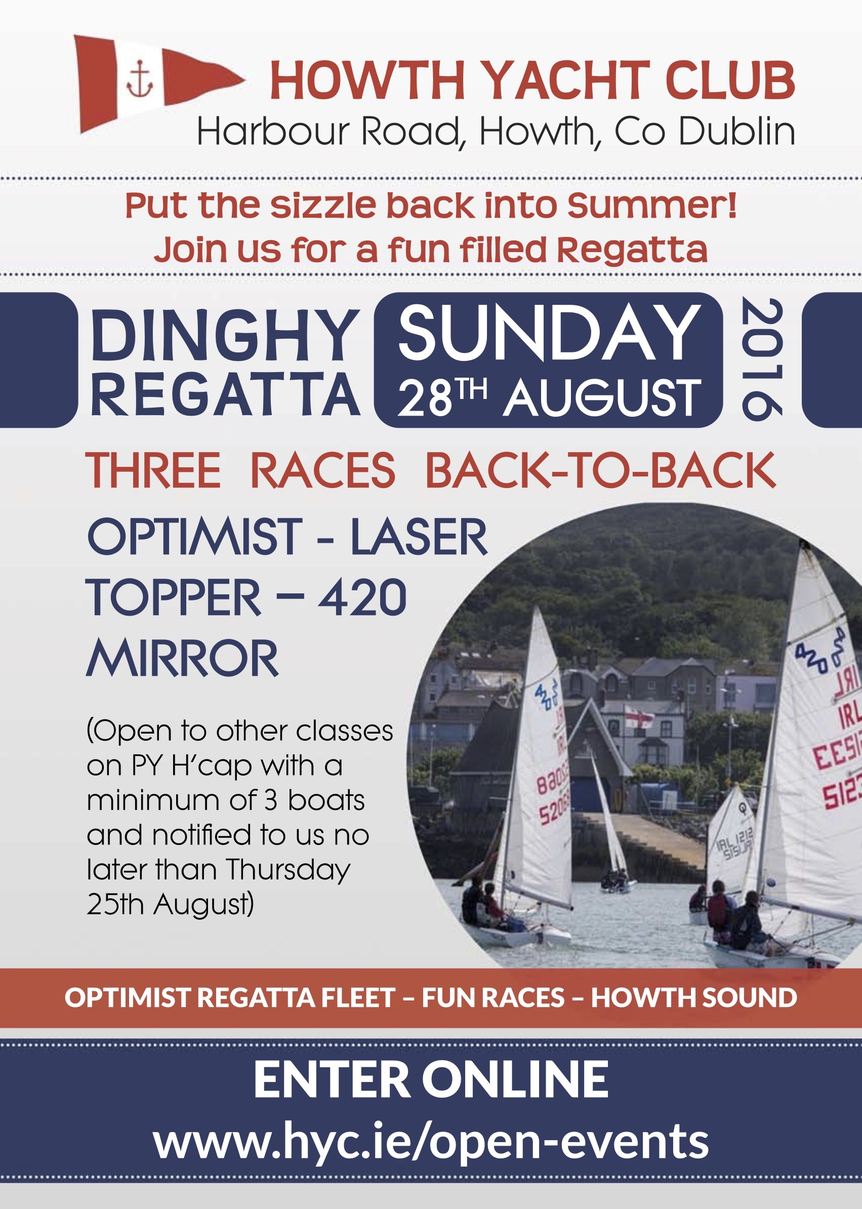 We are hosting our annual Dinghy Regatta this year in HYC on Sunday 28th August and would like to invite dinghy sailors and racers from far and wide to compete and enjoy our annual regatta. Racing will be provided for the main dinghy fleets such as Optimists, Toppers, Lasers, 420s and Mirrors but we welcome other dinghies who will be afforded the opportunity to race in the ‘Sundries’ division under a PY handicap. We will be running special races for the Optimist Regatta fleet with some great prizes for our younger competitors! For those of you just starting to sail (many enjoyed the summer sailing courses), we plan to run some fun races in Howth sound for the ‘Optimist Regatta Fleet’. Based on previous years, we know that the kids really enjoy this and it is a great opportunity to get back on the water after participating in the summer sailing courses.
