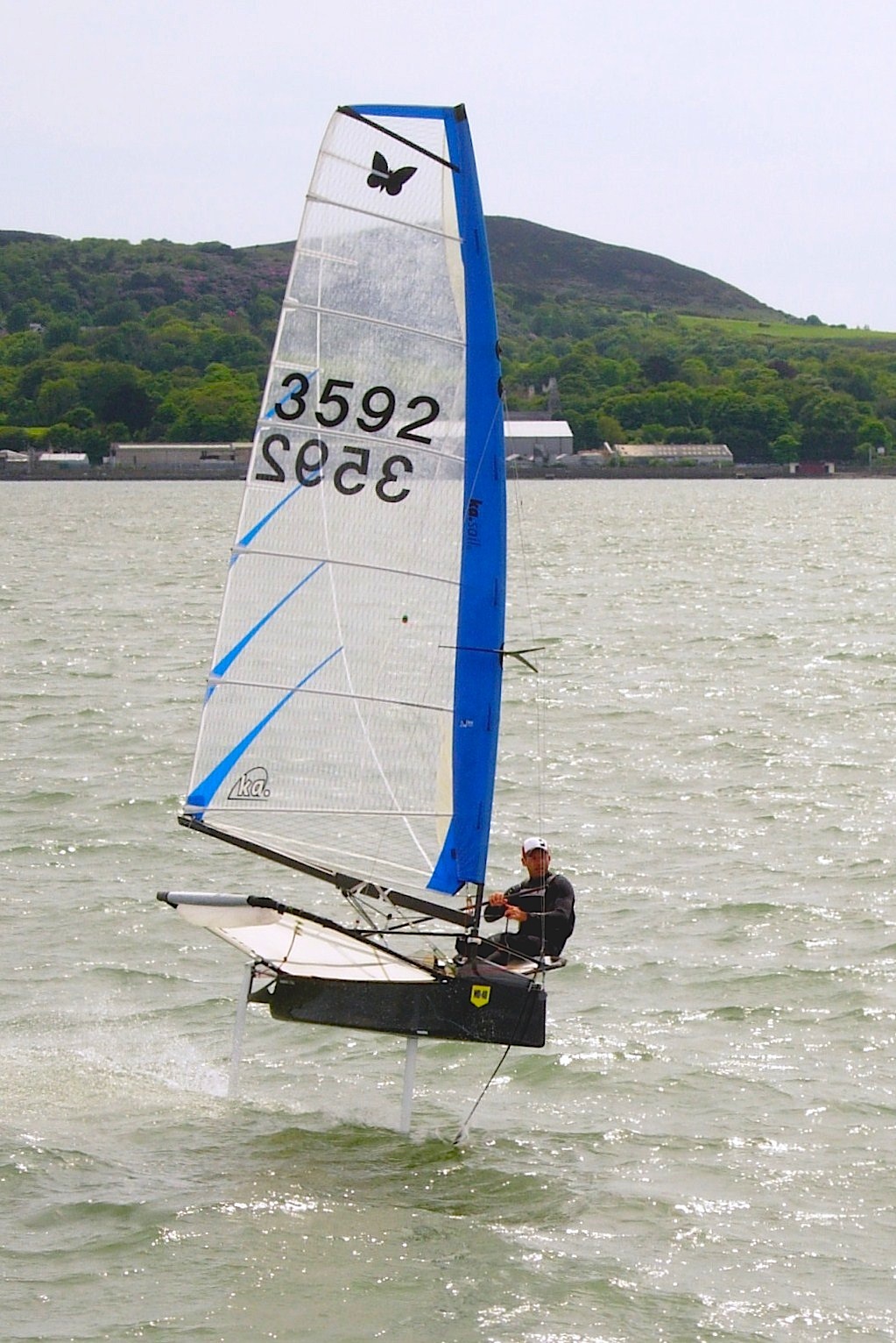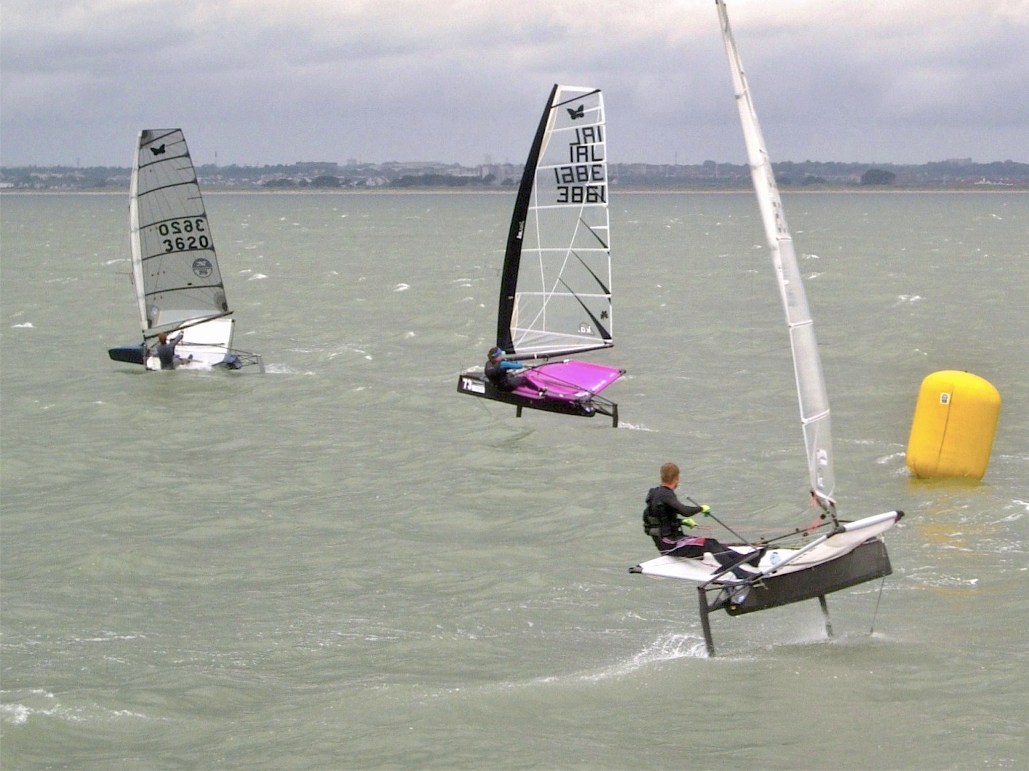 Six competitors climbed onto their craft on Saturday morning to be left with barely enough wind to keep the Moths from sinking. Alistair Kissane, John Chambres, Annalise Murphy, Rory Fitzpatrick, Ronan Wallace and Ben Lynch crept onto the racecourse with 7 kts of breeze, then the underwater foils started to function and the battle commenced, only to be stopped when the wind dropped to nothing. A short wait allowed the sailors to tweak things. Don't ask what the things were or what they did....some tiny bolts and bits of thread is as much as most of us would recognise.