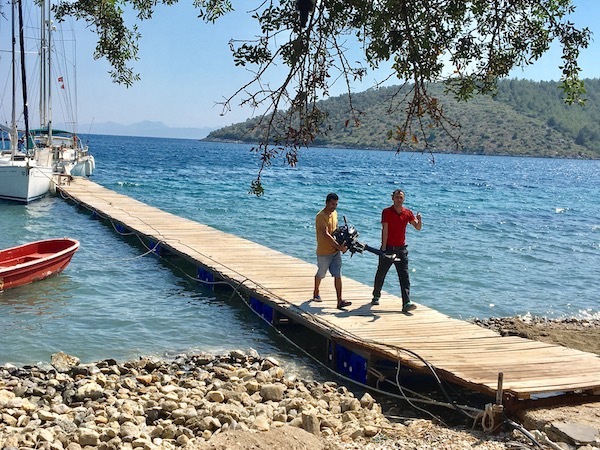 ramshackle pontoon and tied us up, we were a bit disappointed at first as their was a really nice pontoon at the next taverna that would have suited us better, however, we decided to stay and after tidying the boat we went to have some lunch. The boat man was also the waiter, a nice guy with those very dark Turkish looks, he was enquiring as to what happened my face, I had the look of someone on the wrong side of a punch up, I was telling him what happened and the problem of the engine not firing up on the dinghy, I am good mechanic man, I take engine to fix whilst you eat, and after serving up a fine lunch he heads down the pontoon with the younger waiter, off with the engine and they take it into the taverna, fix it to the back of a chair, out with a few tools and strips the carburettor apart all over the table, he goes off for a sowing needle and cleans out all the jets and puts it all back together, then back on the dinghy and the two of them head off out into the bay for a test drive and to tout another yacht seen coming in, now that's what I call multi tasking and all in the time we ate lunch. We spent a few days here and it was all very enjoyable.