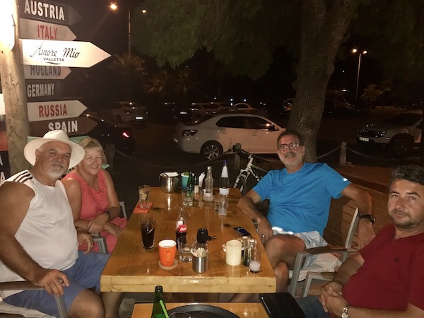 his yacht Papalina here when not cruising, he flew in from Istanbul especially to meet us and we enjoyed his company before he set off single handed out into the meltimi and the Greek islands that he loves so well. We exchanged gifts, chocolates and Turkish delight for Linda, and a bottle of Jameson Whiskey for him, so much for muslims not drinking alcohol, Memdhu loves Irish Whiskey and can fairly put it away.