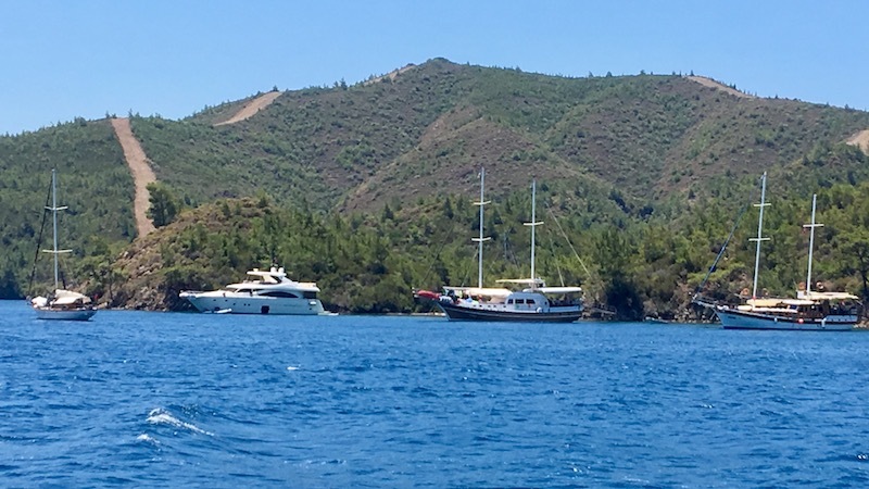 We arrived at a small cove some twenty miles from Turgutries to drop anchor for the night, the water is deep in all these coves and the Turkish skippers favour taking a long line ashore having dropped anchor in often thirty meters of water, they have this off to a fine art and can do it quickly in lots of wind.