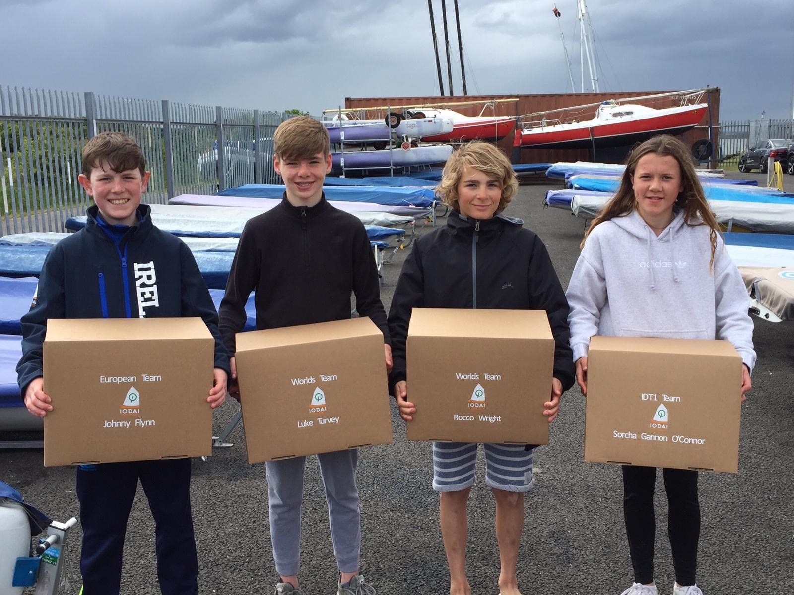 JOHNY, LUKE, ROCCO AND SORCHA WITH THEIR IRISH PACKS (Some of the Howth sailors that made IODAI teams were also presented with their international gear at the event and we wish them good luck in the Europeans, Worlds and IDT1 events.)