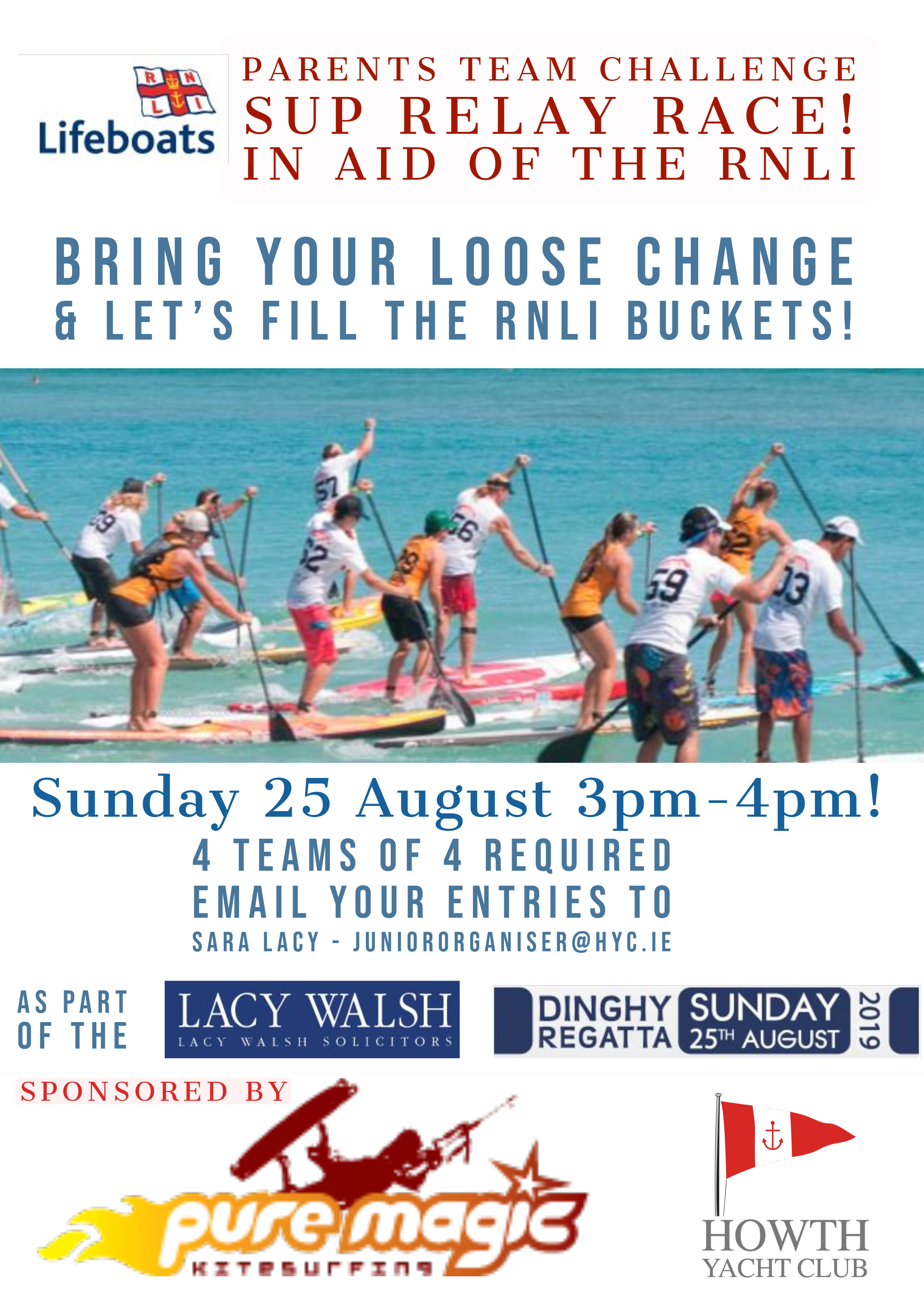 As part of the 'fun element' of the HYC Dinghy Regatta, the club will be running a charity Stand-Up-Paddleboard Relay Race at 3pm on Sunday 25th August. The idea is to engage the parents in a bit of fun before the Prizegiving for the HYC Dinghy Club Regatta. The event has been registered as a fundraiser Howth RNLI and it's on their website and is open to parents of the participants in the HYC Dinghy Regatta.