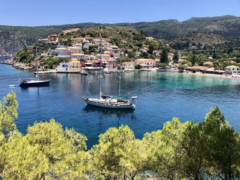 That said, Linda and I were not deterred and off we set for the short hop to our favourite port of Fiskardho two hours to the North. We had set off early in order to find space to tie up on the town quay, it was wall to wall with nearly two hundred boats including several of the dreaded monster boats. Several flotillas of charter boats rafting up in great numbers. We dropped anchor outside the port and ran a long line to some rocks ashore. We found ourselves being neighbours to a massive ketch rigged yacht over sixty meters long, it was owned by the founder of the Spanish clothing company Mango, he is a Turkish guy and his family were arriving from Barcelona that very night. The crew were busy with the usual cleaning all day, boat loads of supplies were being loaded from her tender which, I may add, is forty five foot long. The tender follows the mother ship from port to port.