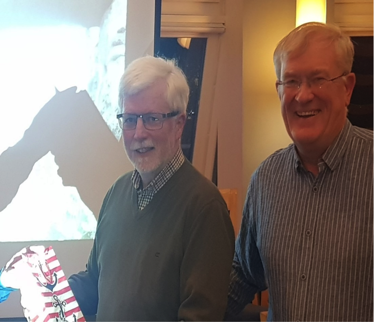 Photo below shows Brian Lennon being presented with a bottle of red wine by Willie Kearney- Captain of the Cruising Group.