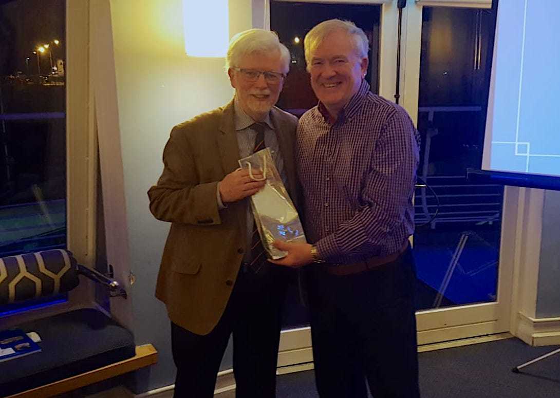 HYC Cruising Group's William Kearney presenting Brian with a bottle of wine in appreciation of his talk.