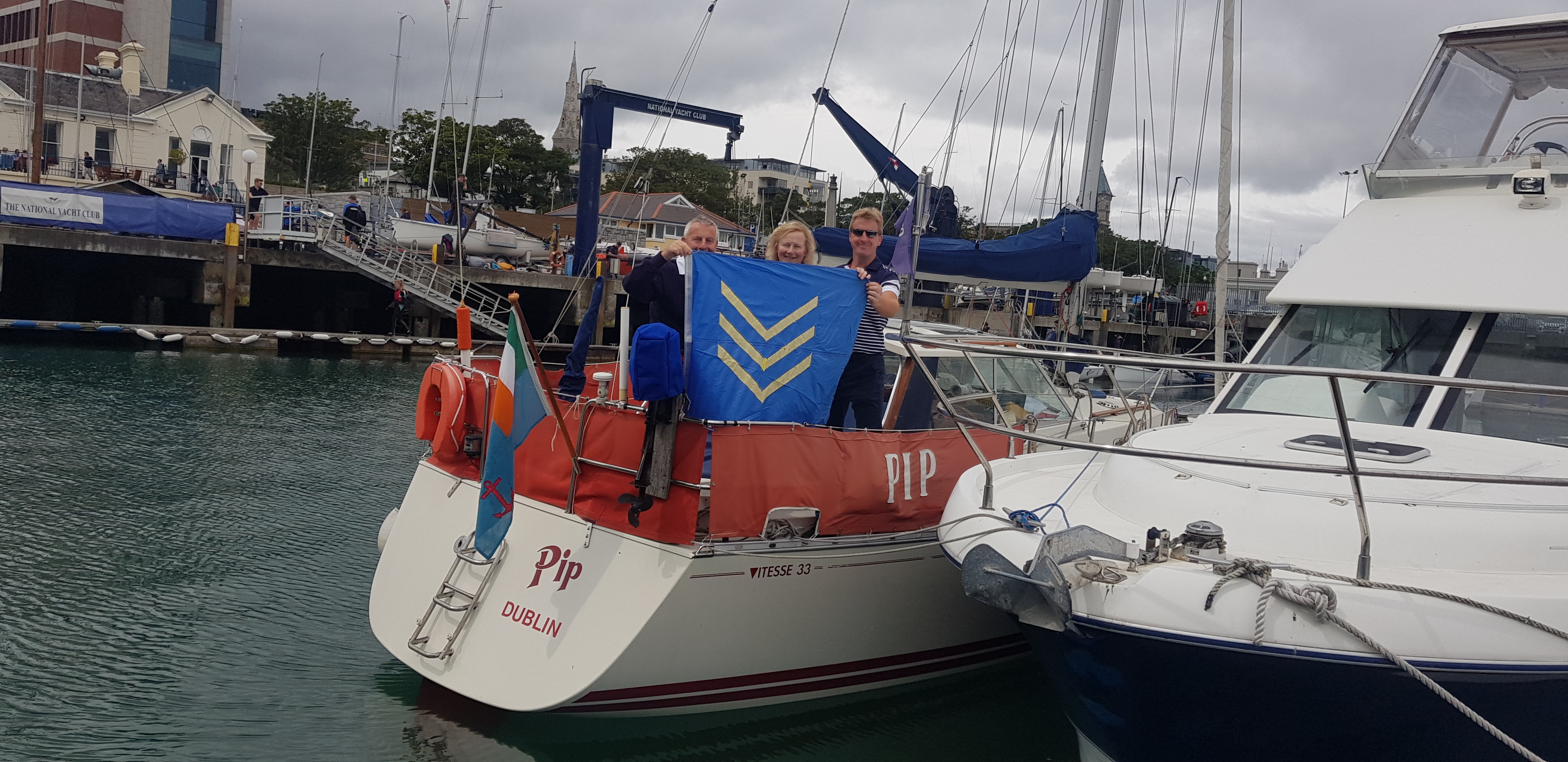 Gerry Sargent can be seen below proudly waving his specially commissioned flag for the event i.e. the flag insignia with three inverted Sargeant stripes (Chevrons) with sister Aileen and his son Dave Sargent on board his yacht "Pip". Photos of the event can be seen in the Gallery attached here.