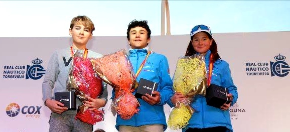 HYC’s Rocco Wright (left) Silver Medallist in the 401-boat Optimist Euromarina Trophy Regatta in Alicante at the end of January with Gold winner Alessandro Cortese (centre) and Bronze Medallist Lisa Vucceti
