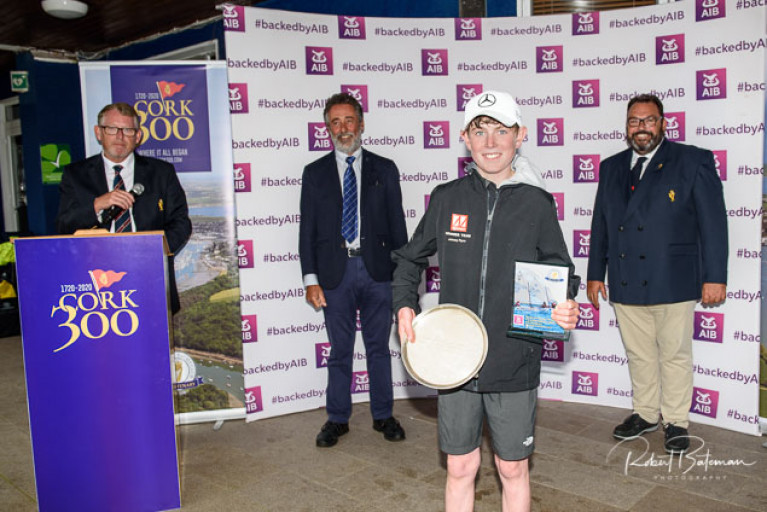 Into the limelight – young Johnny Flynn of Howth takes the Irish Optimist Nationals in August by one point at Crosshaven, with RCYC Admiral Colin Morehead on right in a socially-distanced ceremony Photo: Robert Bateman