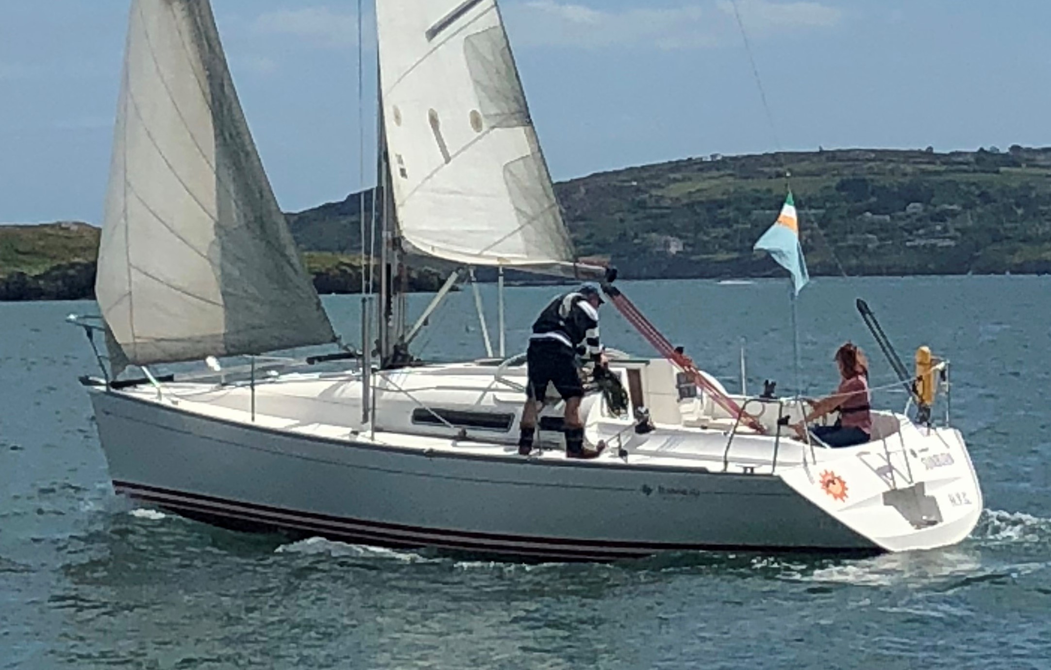 HYC Commodore Ian Byrne – Ireland’s “Sailor of the Month” for May 2020 – leads the post-lockdown move back to sailing on his two-crew-compliant Sunfast 32 Sunburn on May 24th, with Leah O’Donoghue socially-distanced on the helm, and everyone within five kilometres of home