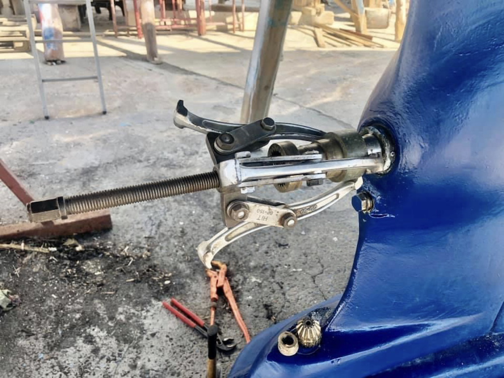 I’m going to change it back to 22 when we lift out again as the auld Perkins engine is running a bit hot at this pitch. There is a brilliant drop down bow thruster on the Amel, it needs new seals, oil and bearings every few years. I set about extracting it from the 9hp motor which should only have took me no more than three hours, it took two days of pounding with a hammer and lots of penetrating oil and some heat from a blow torch, when it went, out of the blue, it was like the condemned man falling from the gallows. The gas thing is that we paid a company in the yard in Preveza five years ago €1050 to do this job, there is no way it could be as seized as it was after only five years, this had not been out in twenty years, the bearings and two gears were shagged and the old gear oil was like treacle. The lesson is that you have to be about when these jobs are getting done by others. I was a good fitter by trade and I did the job properly and will continue to service it myself in future.