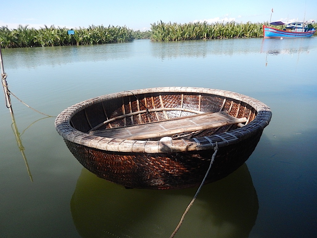 Thankfully there was just a serene calm, with lots of photo opportunities after which Than suggested we needed to stop for refreshment. Taking a right turn towards the sea we entered an estuary, where some large fishing boats were moored,stopping at a place where there was a small awning made from the coconut plants(The groves are cut back every year and the cuttings used as roofing in the locality). The owner squeezed some fresh sugar cane which we sipped while admiring the view. Floating in front of us was a small round basket that I took little notice of until Than explained it was a boat used by the locals to fish for crabs.