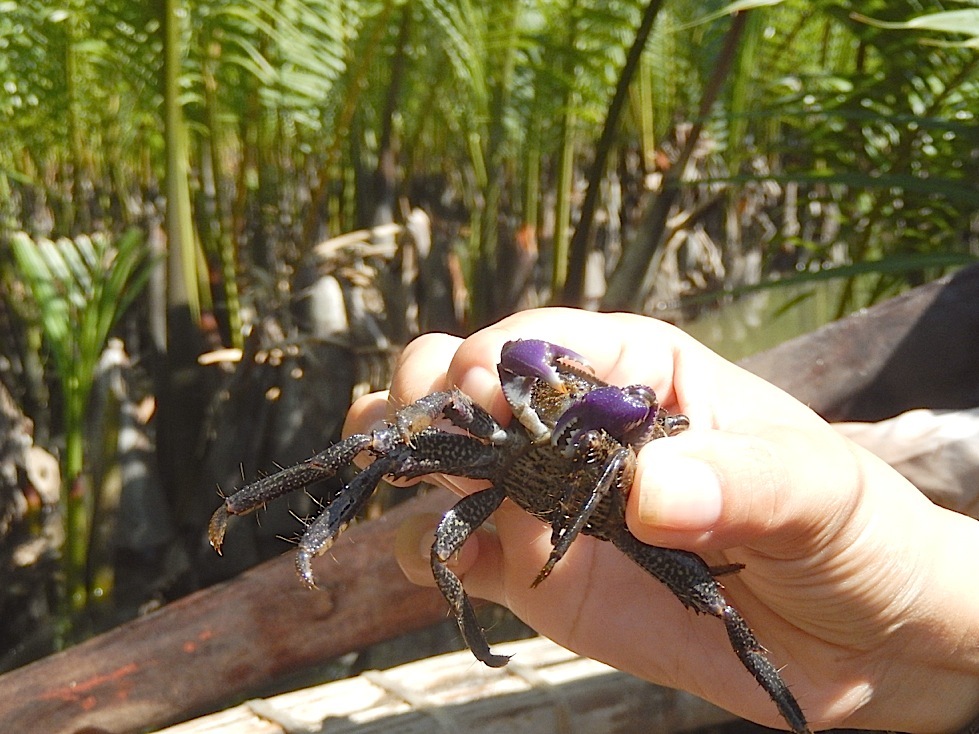 would dive under the water or around the other side of a stem tangling your line in the process while giving time for a good chew at the bait. We caught some, none the less . Perfect tiny crabs with huge purple claws. The locals cook them in a fish stew.